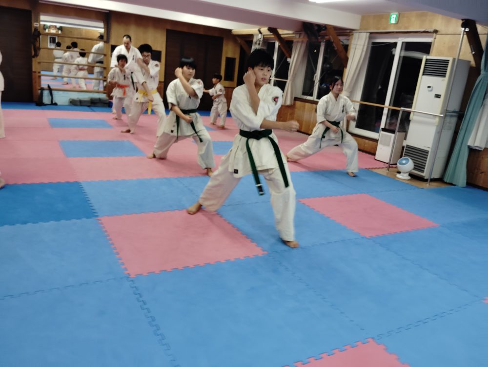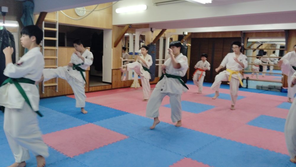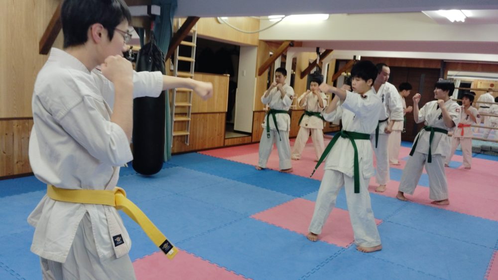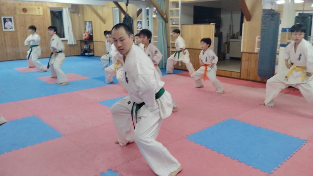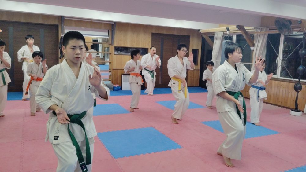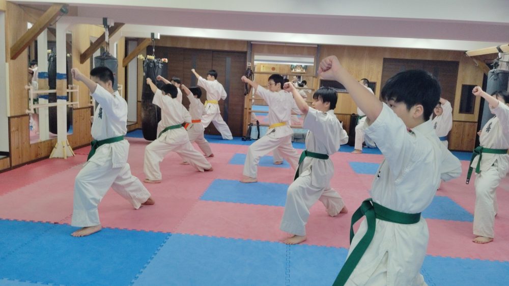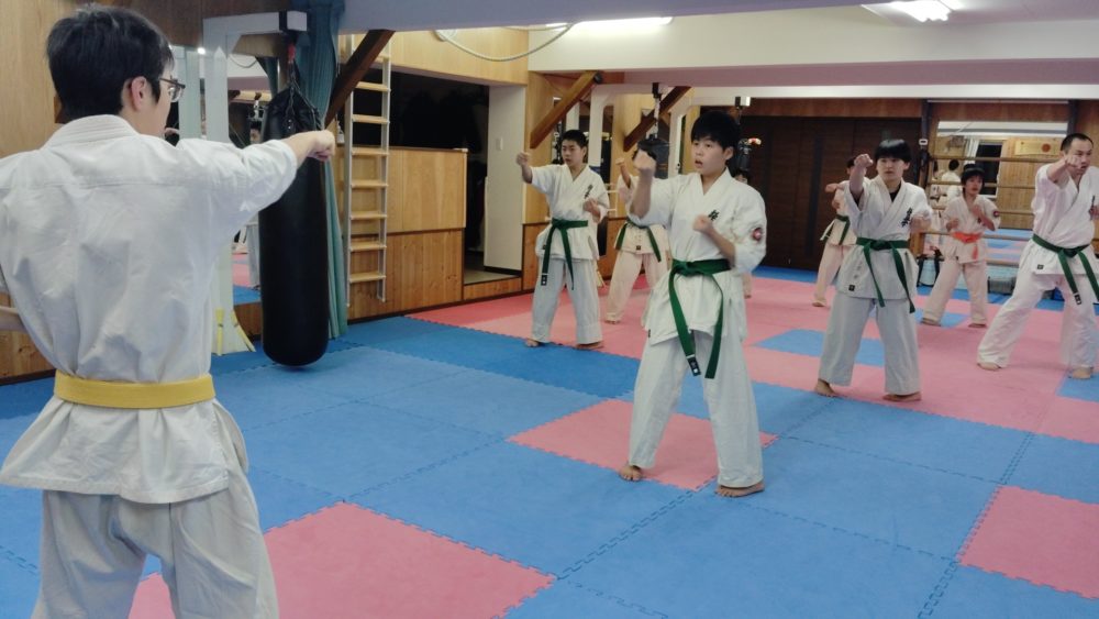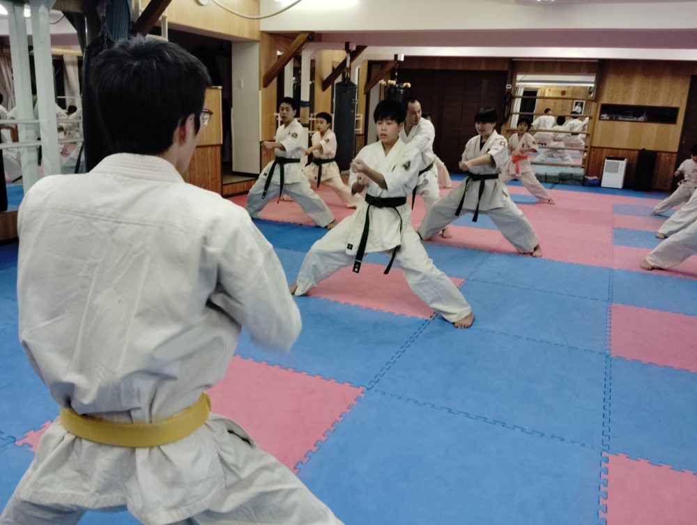 基本稽古、正拳中段突き、上段突き、下段突きと続きます