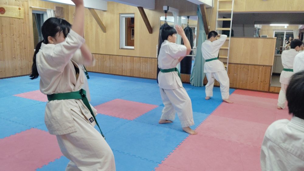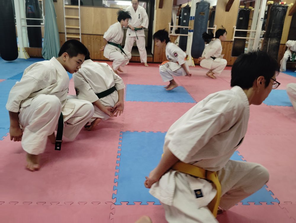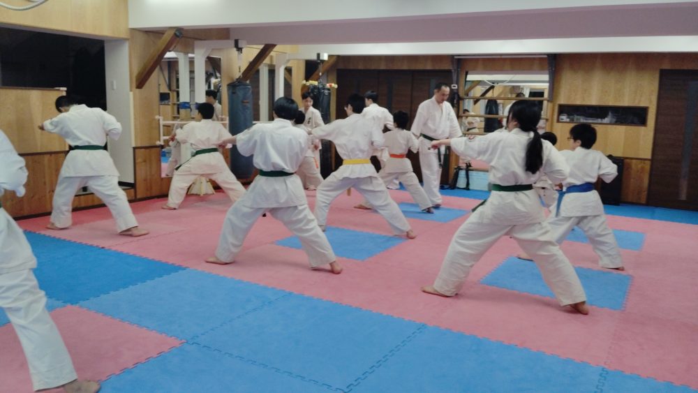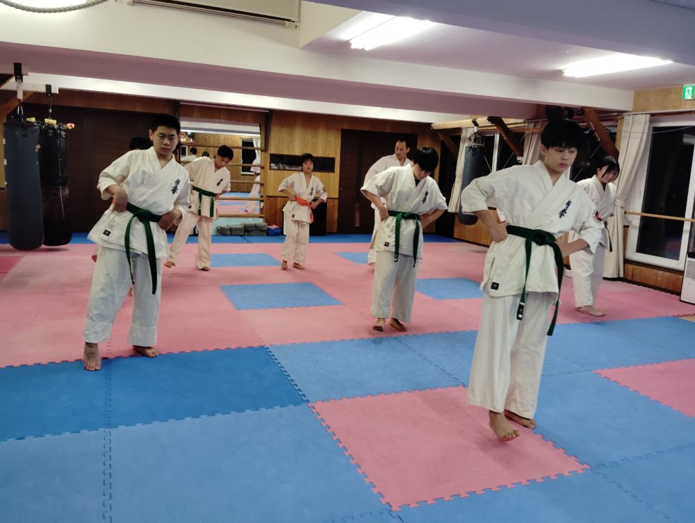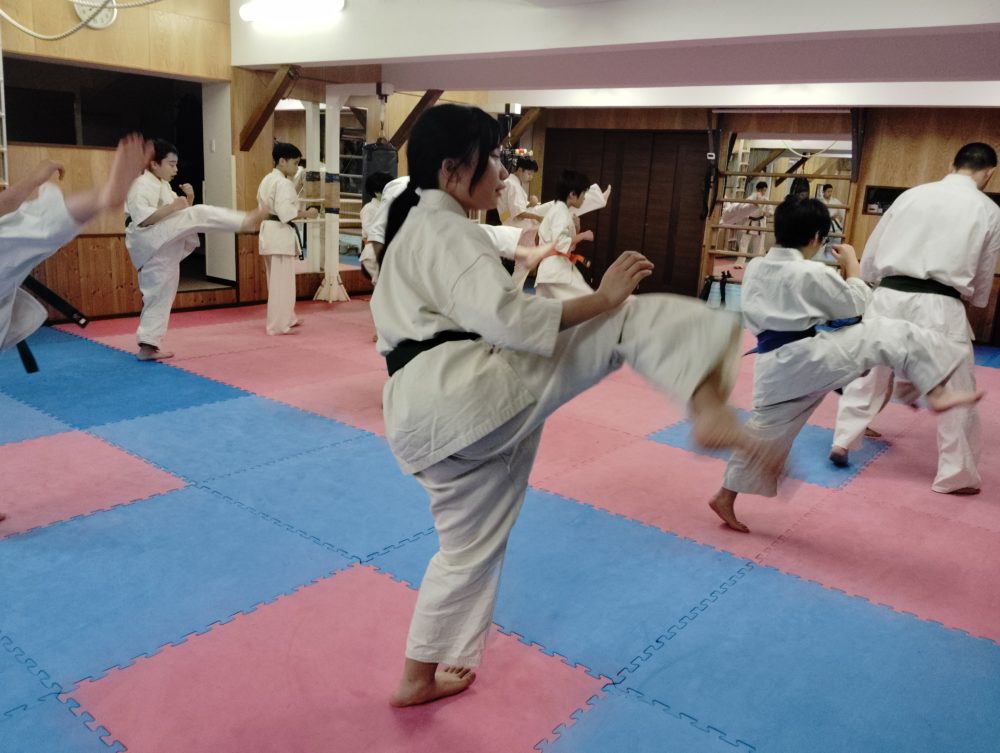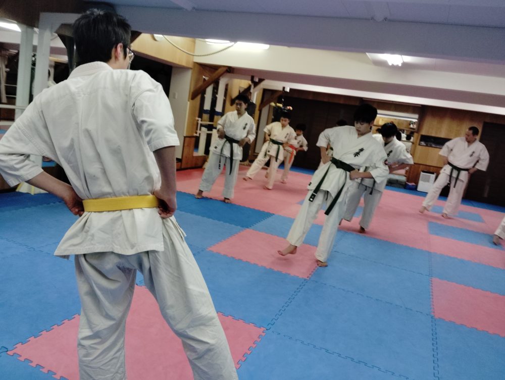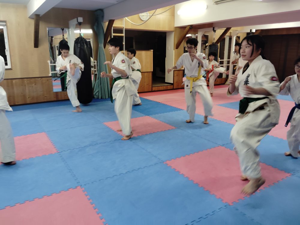 基本稽古、正拳中段突き、上段突き、下段突きと続きます