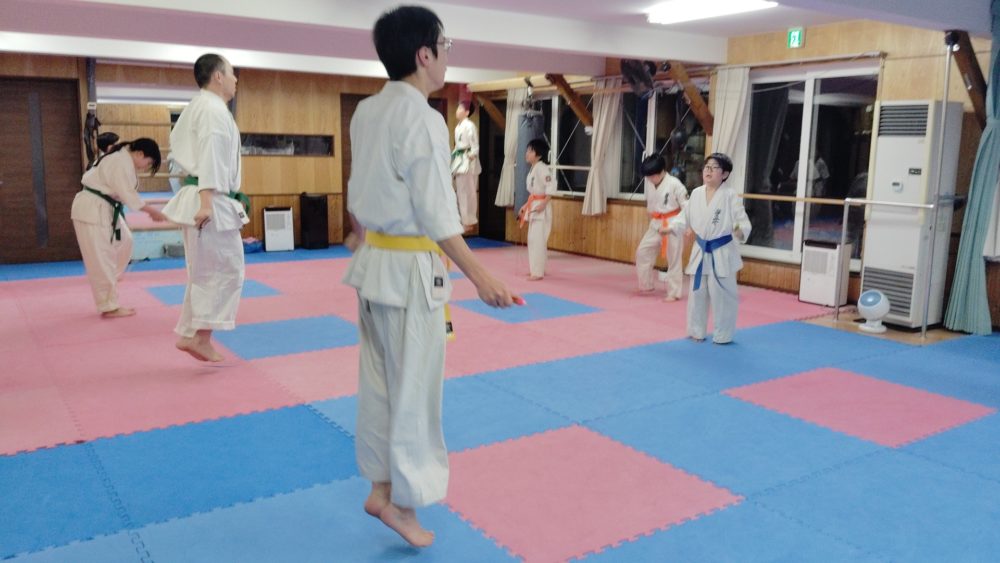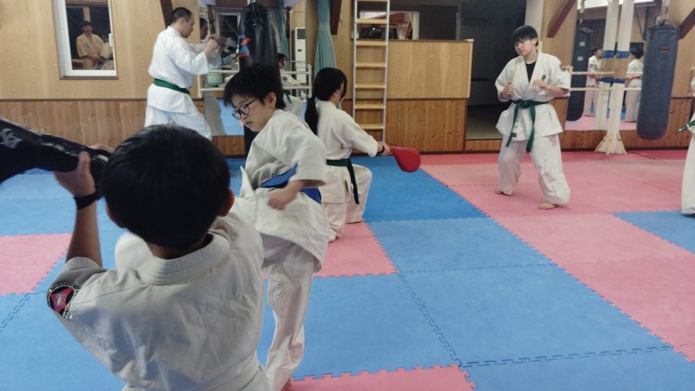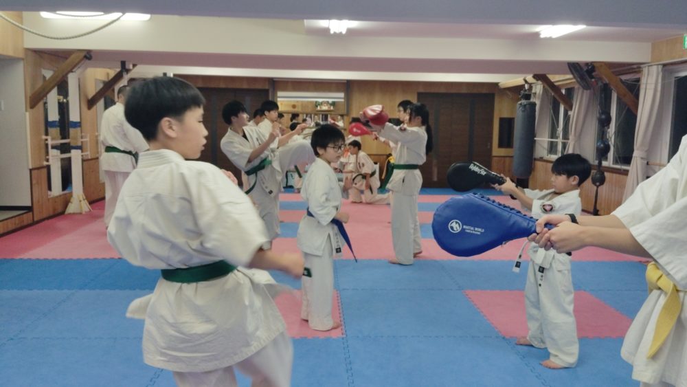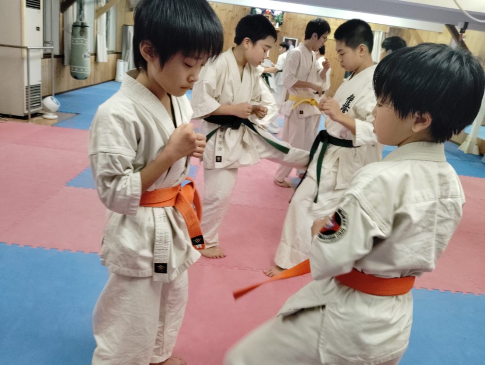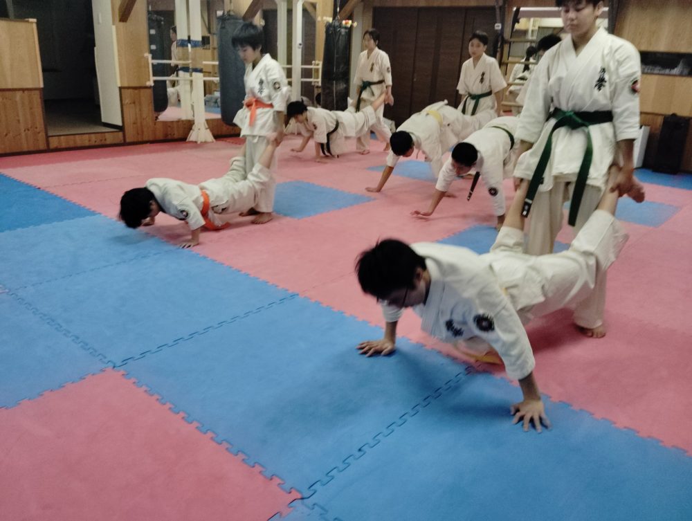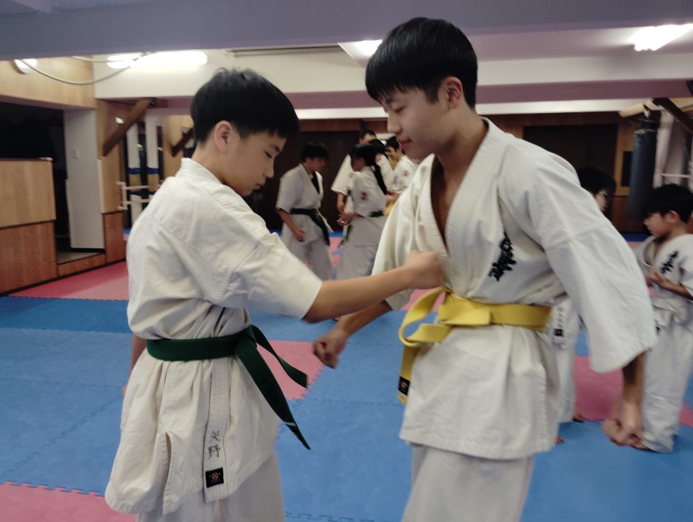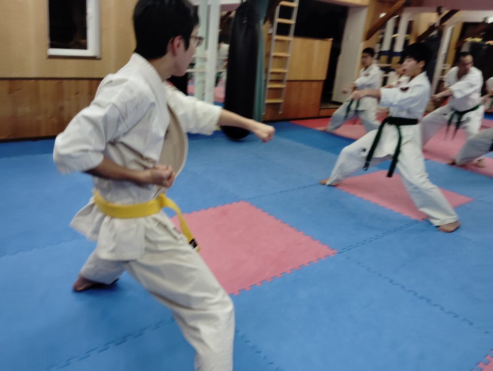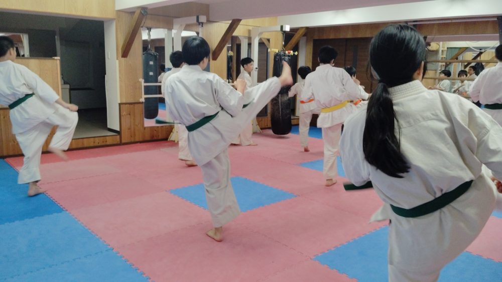 基本稽古、正拳中段突き、上段突き、下段突きと続きます