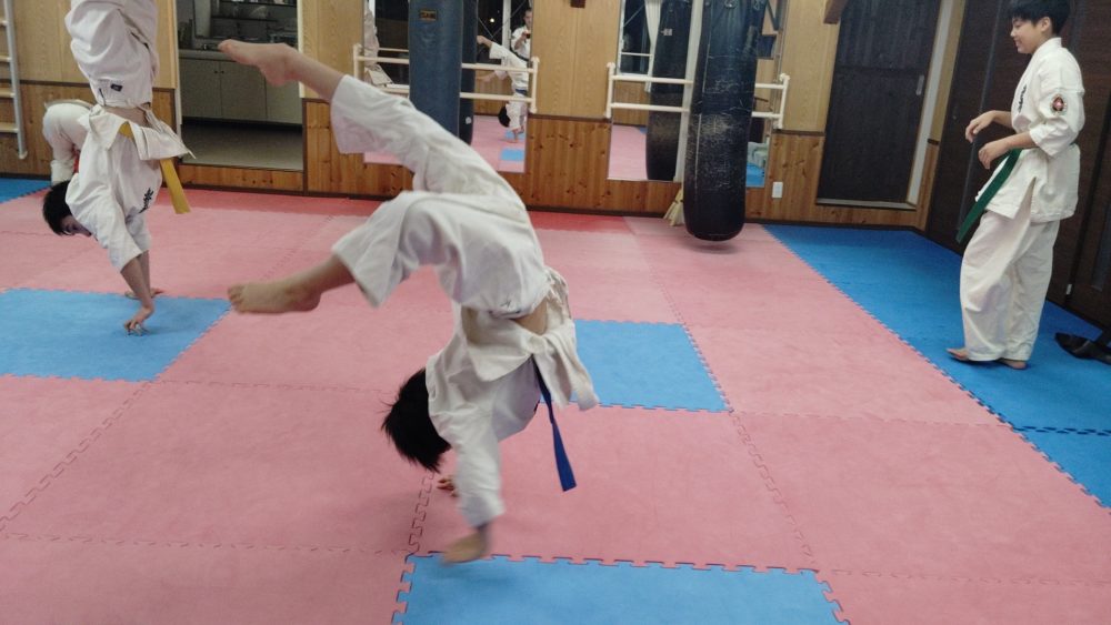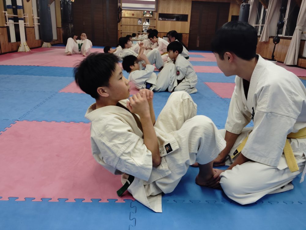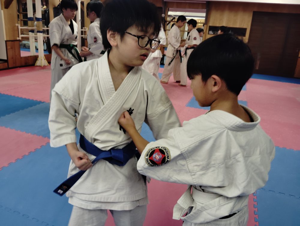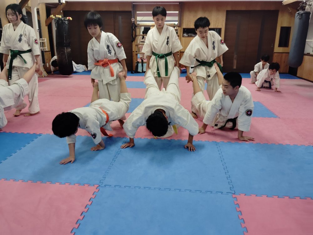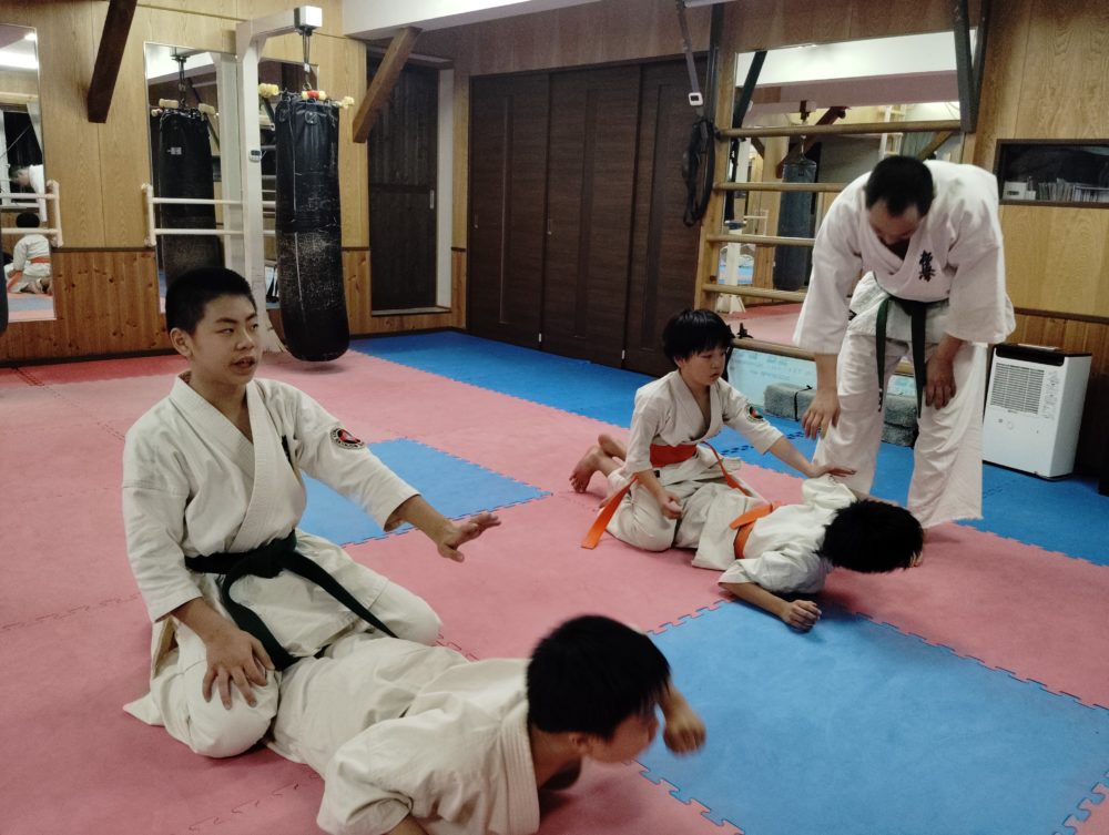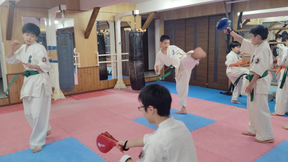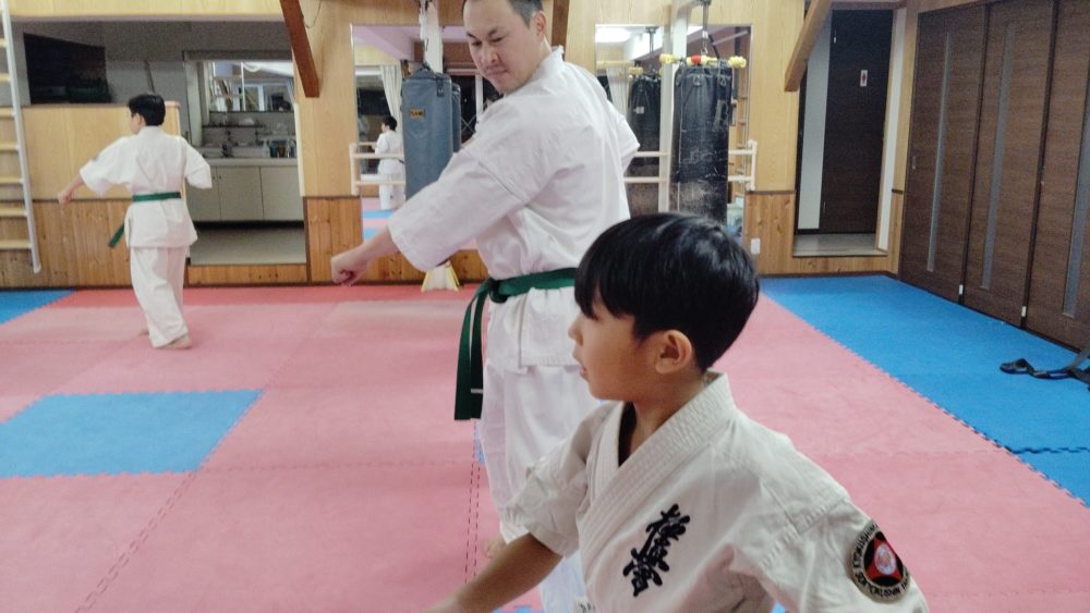 基本稽古、正拳中段突き、上段突き、下段突きと続きます