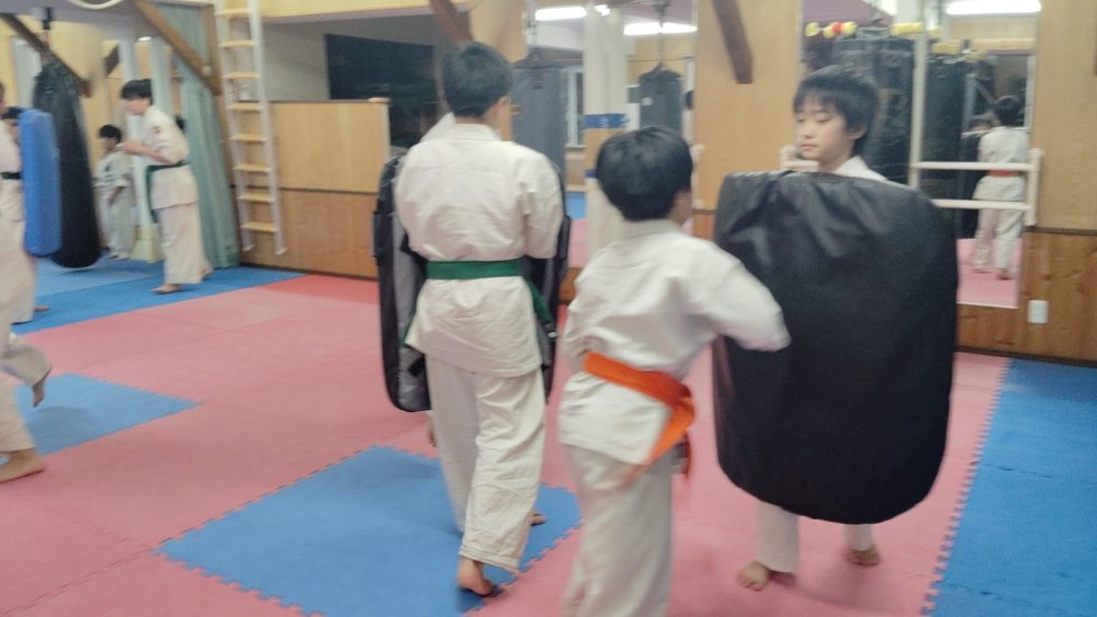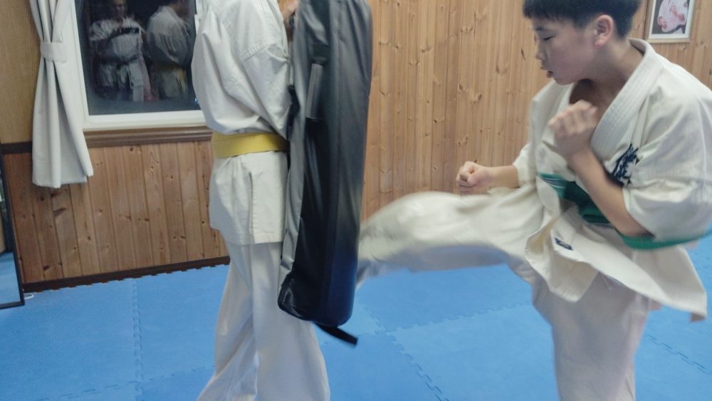 ハンドミットで蹴りの稽古。