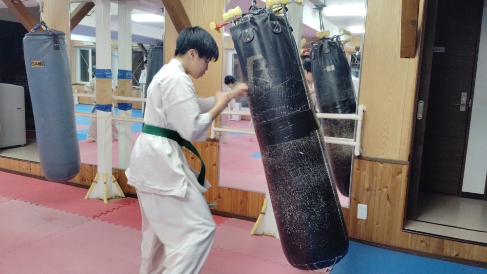 ヘビーバッグに負けないように気合いを入れます。