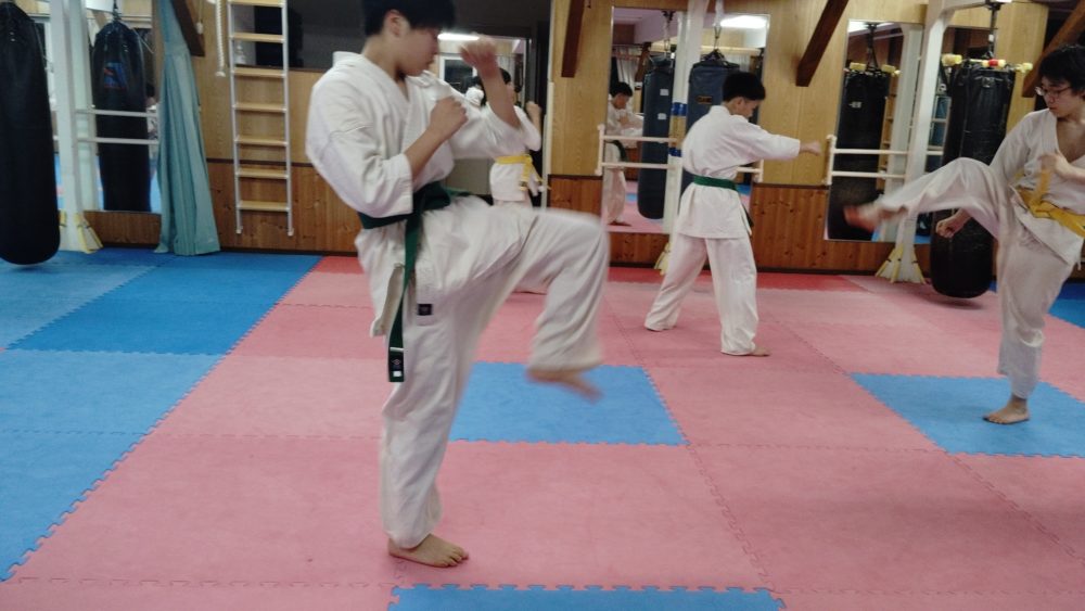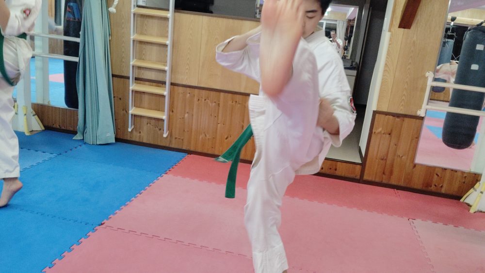 突き、蹴り、受けを入れてシャドウトレーニングを行います。