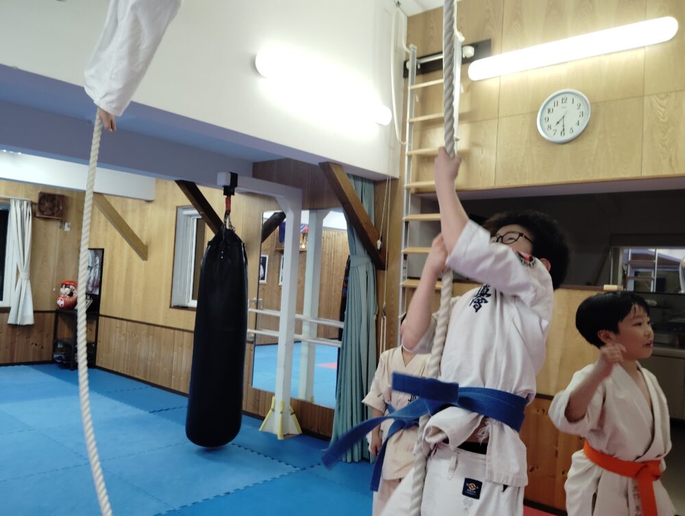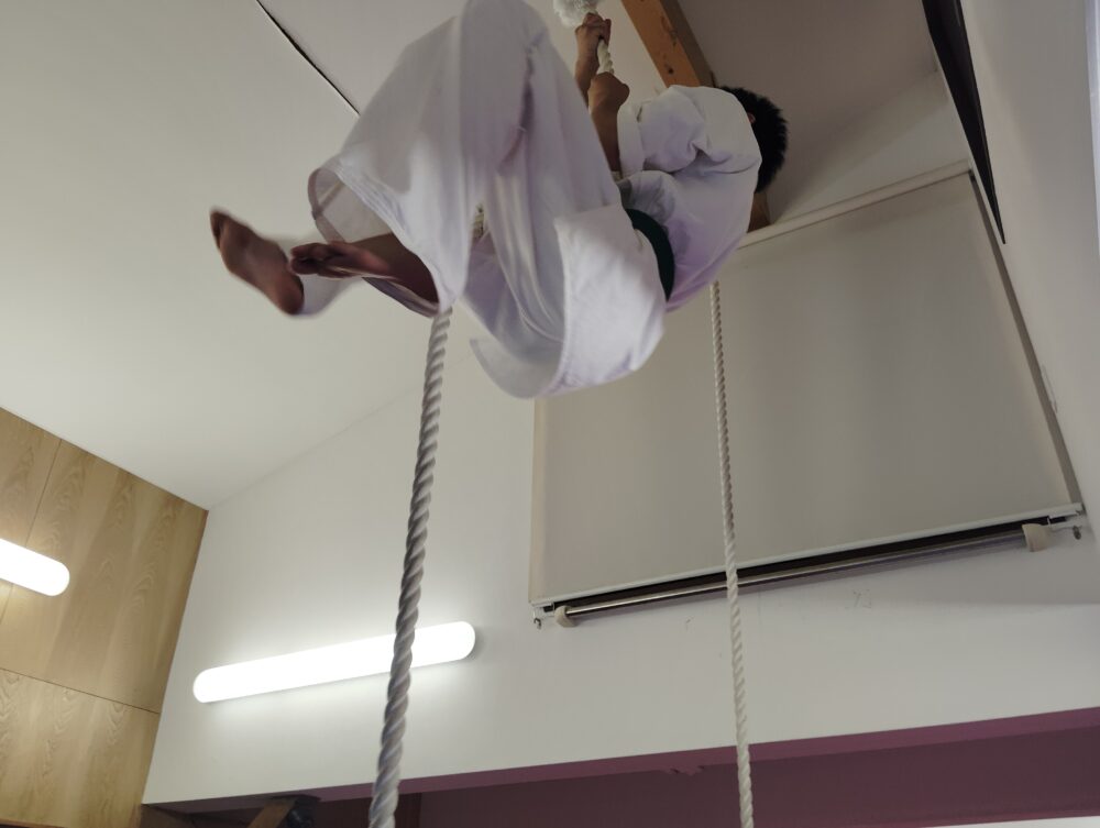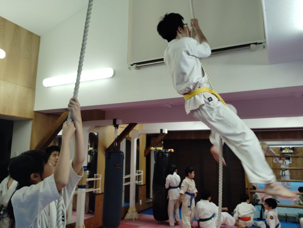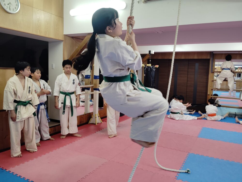 もう一方では綱登り、春道先輩はスルスルと登ります。