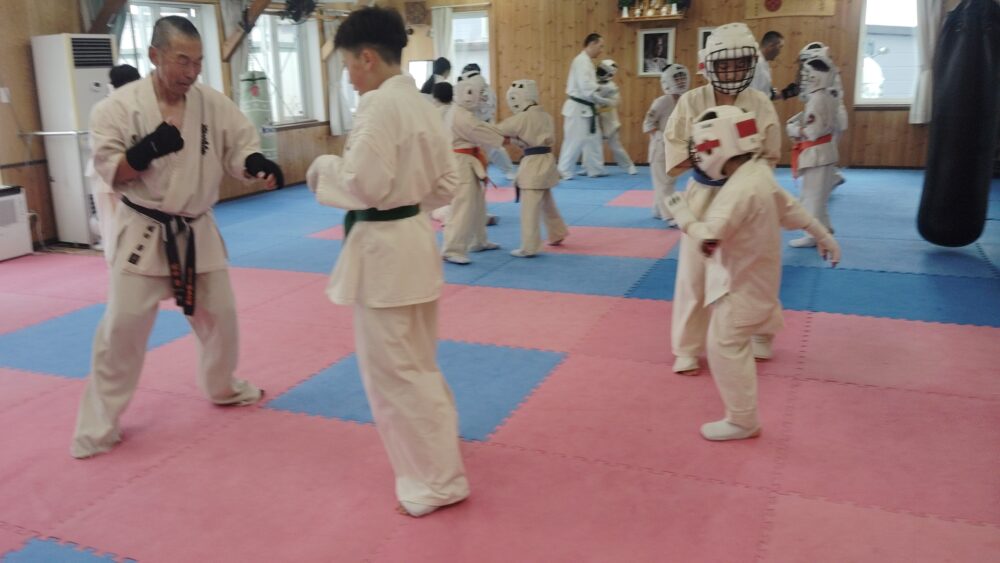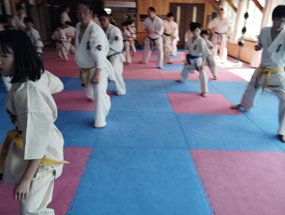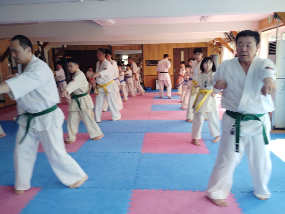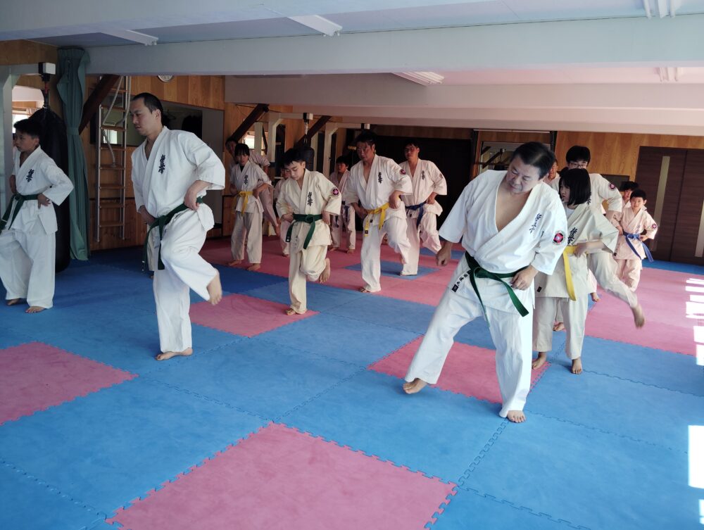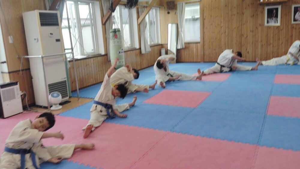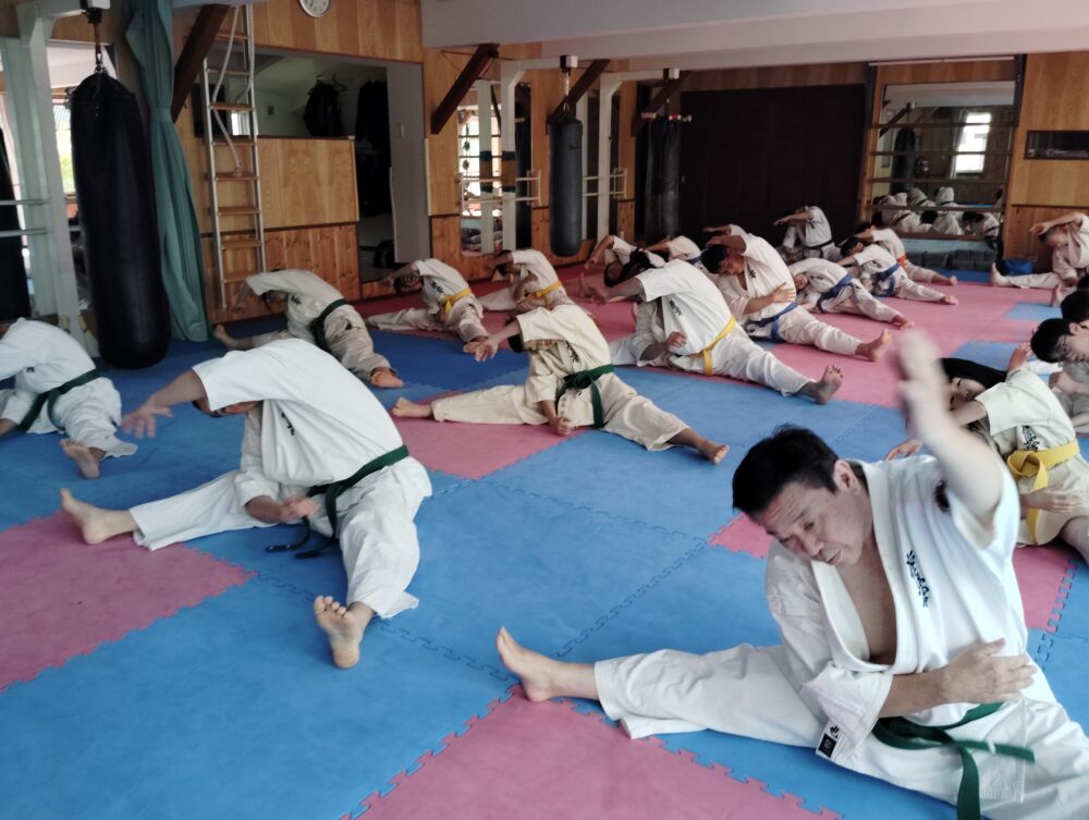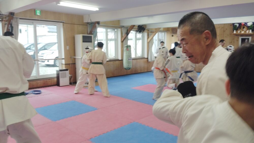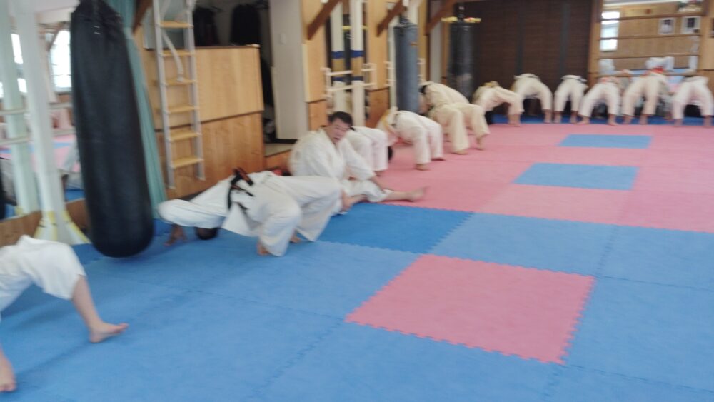 練習会です。準備体操と基本稽古を抜粋して網走支部長の大室健治二段が指導します。