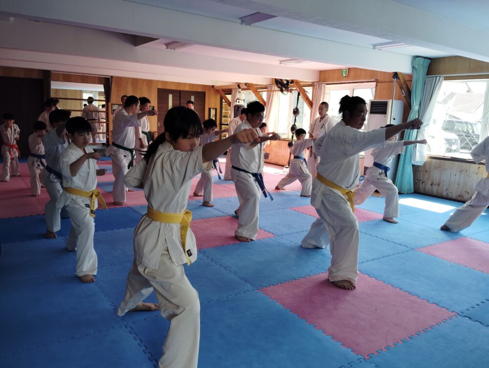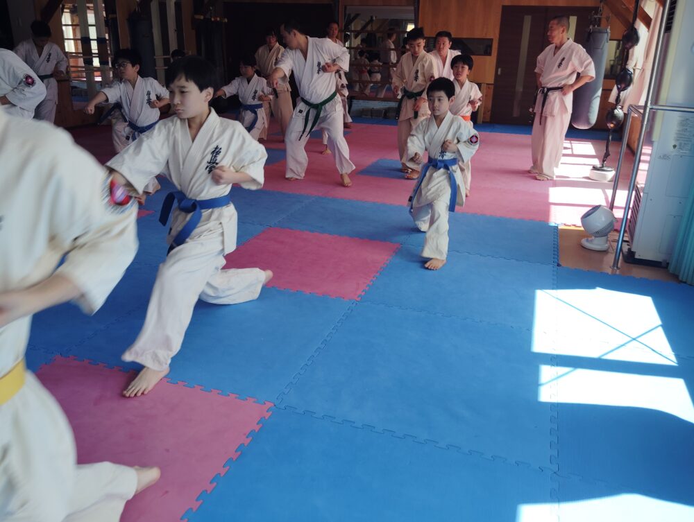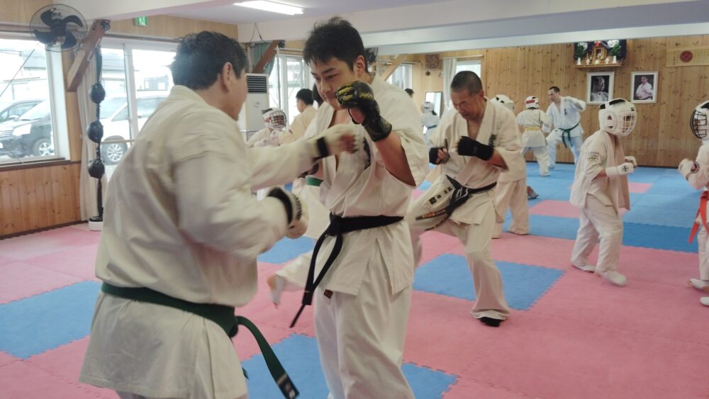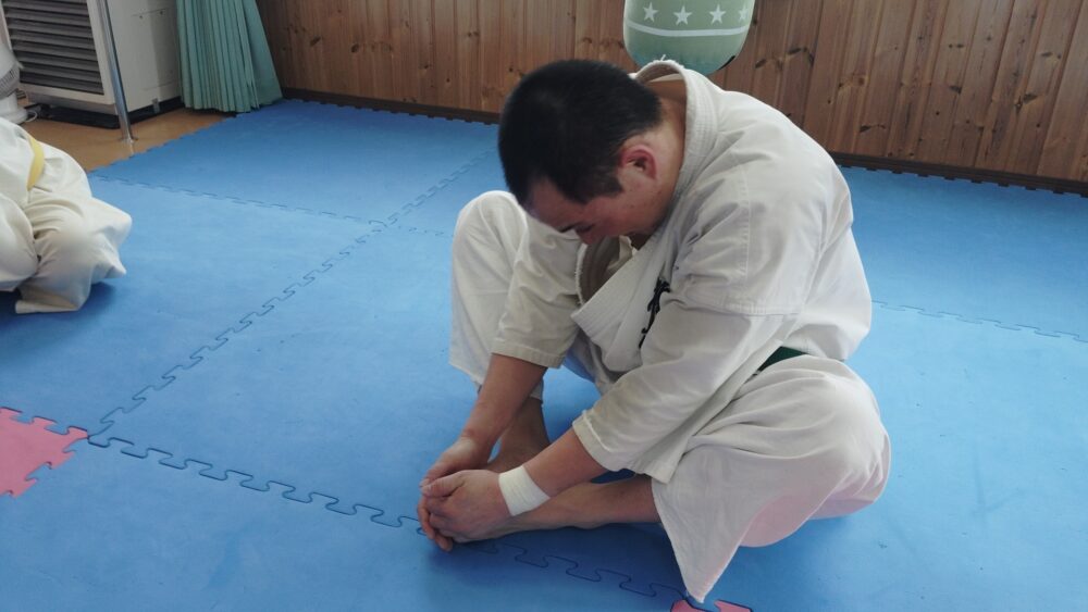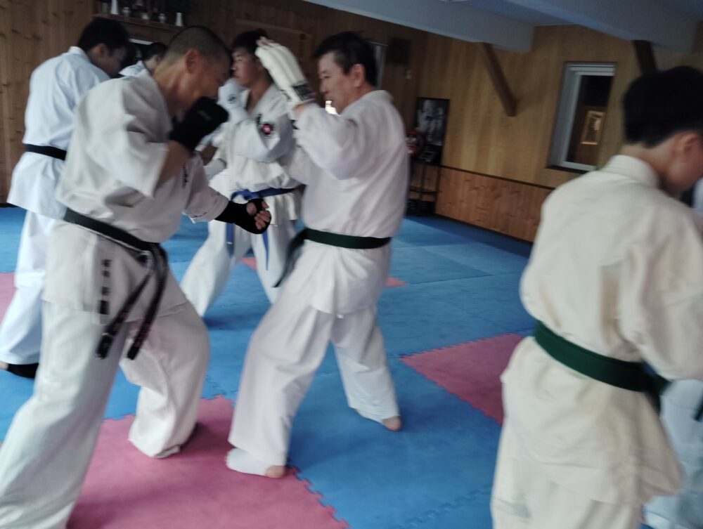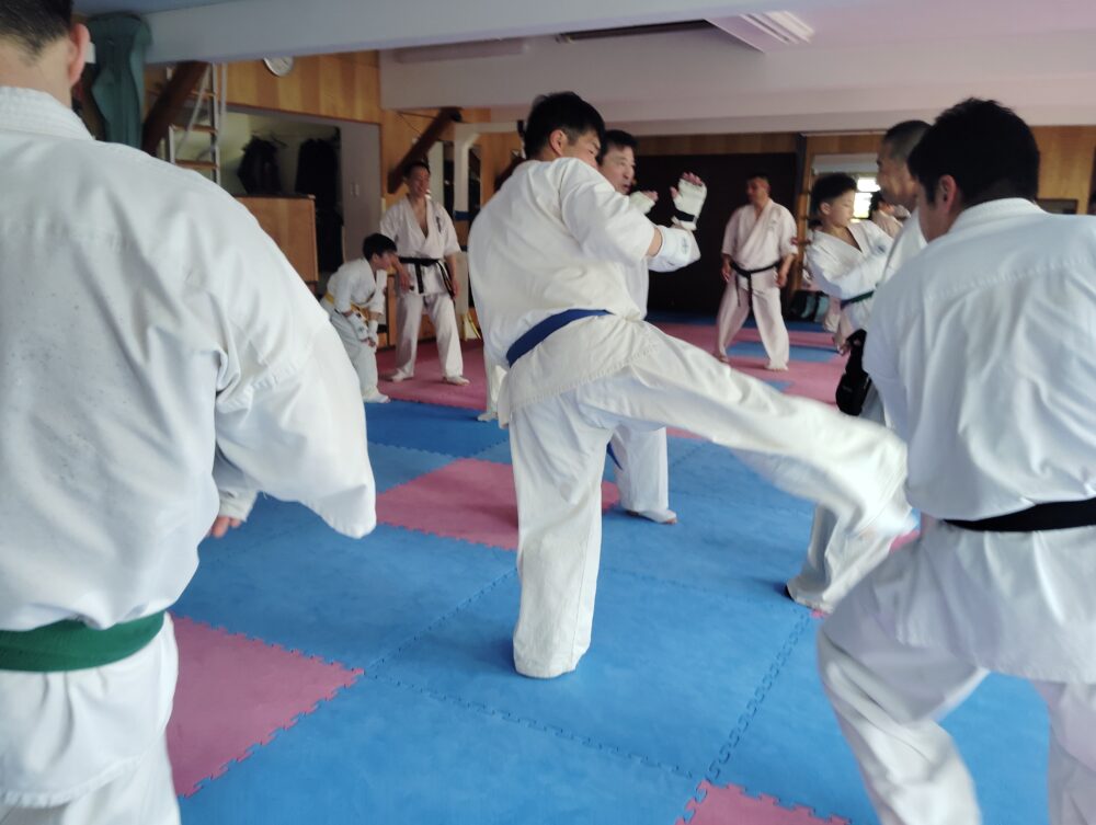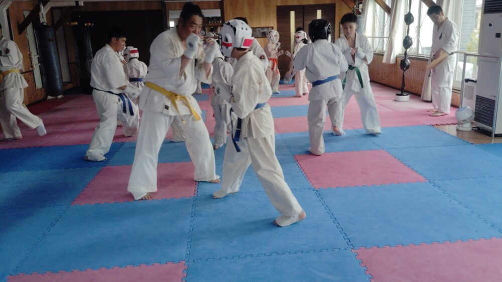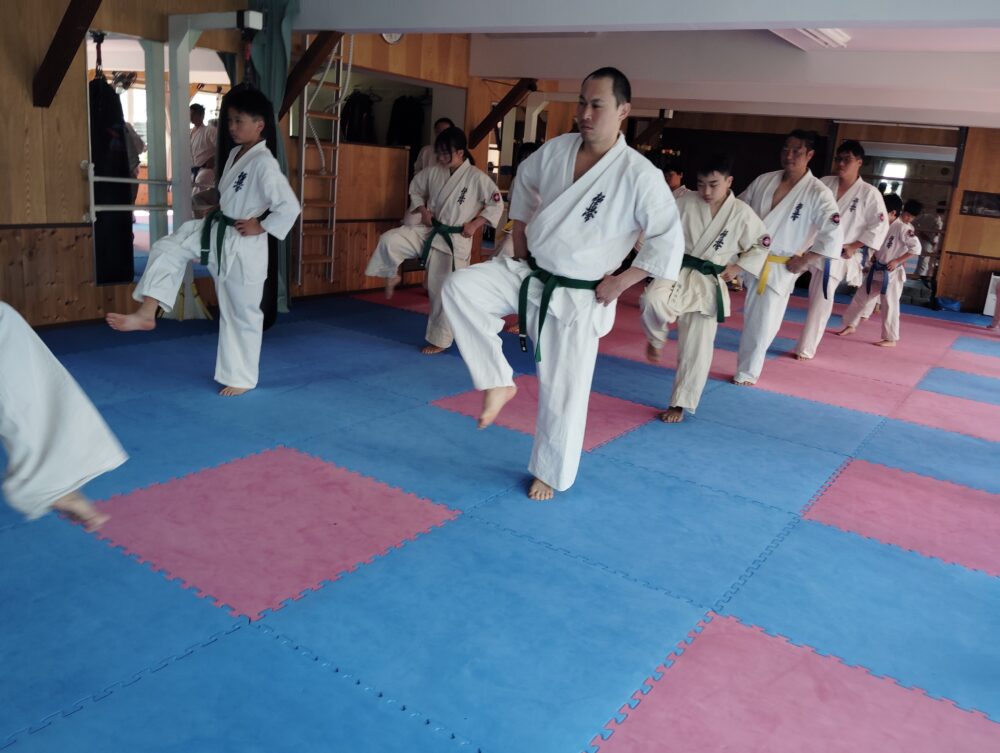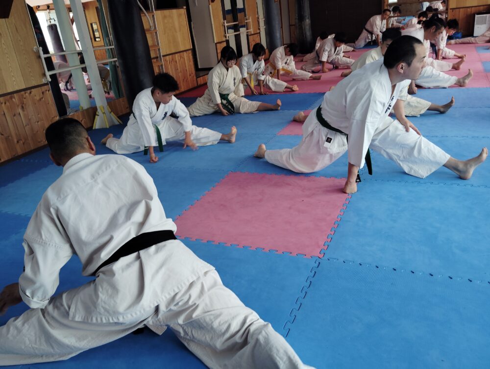 練習会です。準備体操と基本稽古を抜粋して網走支部長の大室健治二段が指導します。