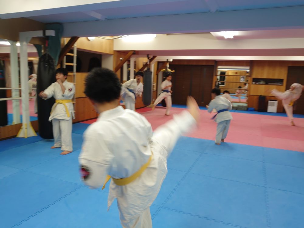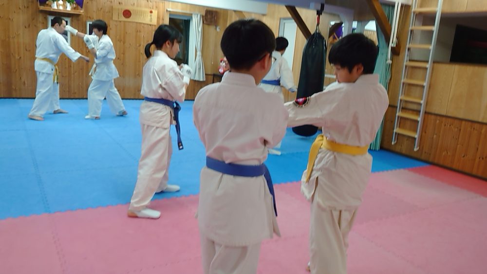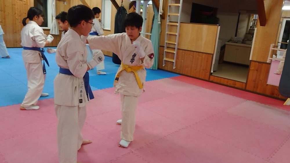 パンチの受け返し、上段回し蹴りの受け方を繰り返し行いました。